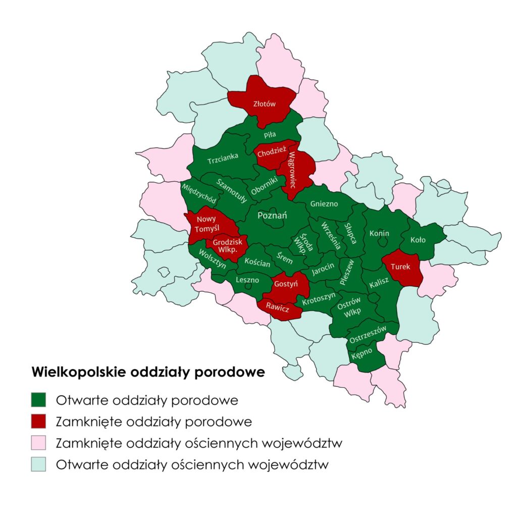 Oczywiście, że tak. Poniżej prezentujemy mapę, na której przedstawiłyśmy aktualnie działające (stan na dzień 19.12.2025 r.) i zamknięte oddziały porodowe. Nawet gdy kilka sąsiadujących powiatów nie posiada działającego bloku porodowego (np. Jarocin, Gostyń i Rawicz), to otoczone one są powiatami, w których znajdują się porodówki – także w sąsiadującym województwie.