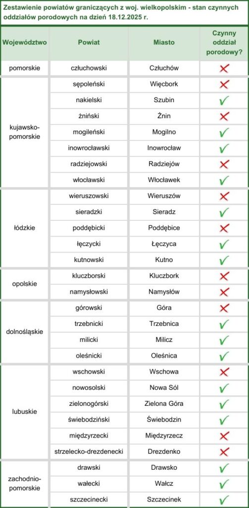 Przeanalizowałyśmy sytuację w powiatach, które graniczą z Wielkopolską. Poniżej znajduje się tabelka przedstawiającą konkretne miasto wraz z informacją, czy działa w nim oddział porodowy.